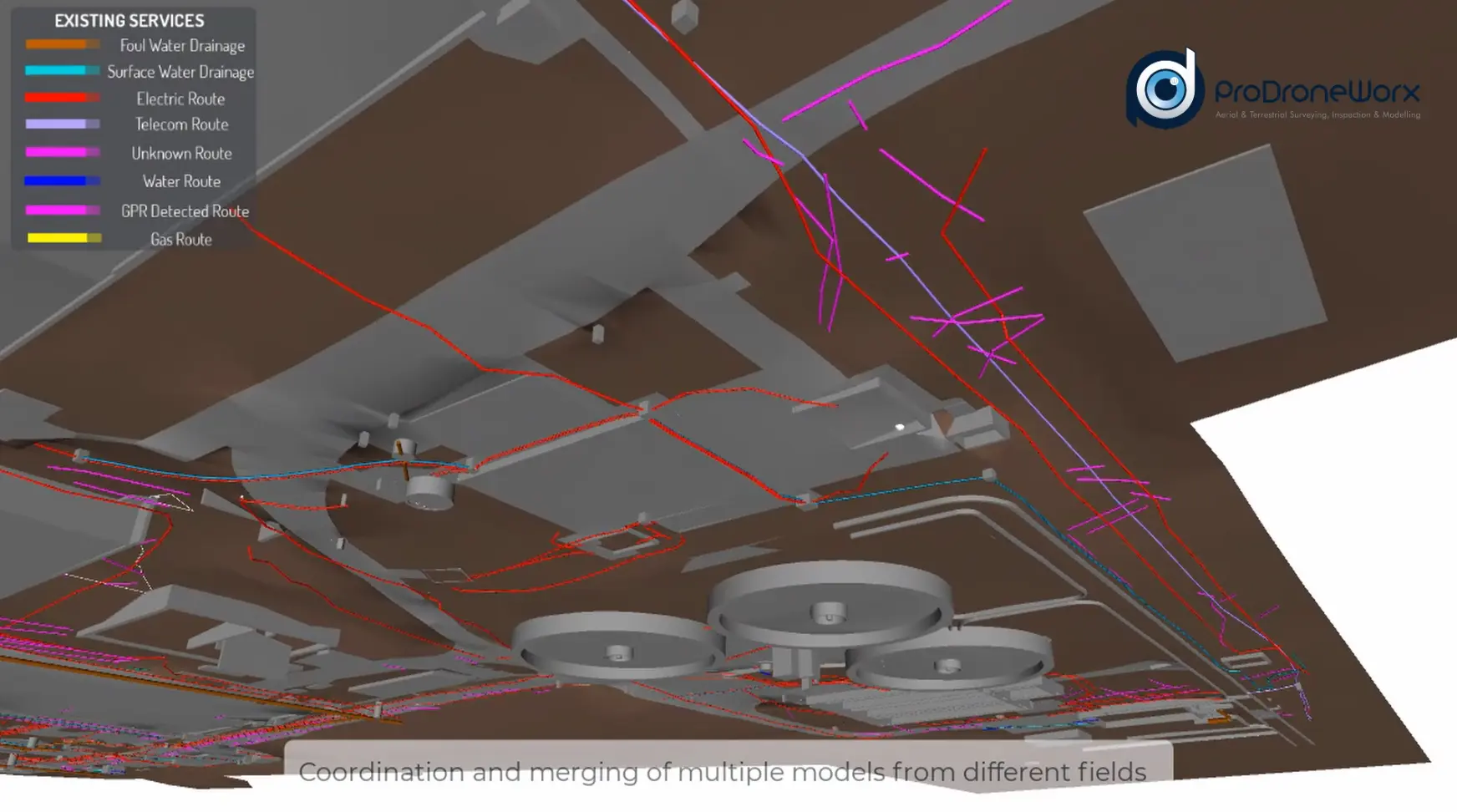 We took the Ground Penetrating Radar (GPR) drawing data in DWG format and brought this into our Revit model environment to the agreed site coordinates & levels. The GPR drawings are single 2D lines, with levels / depths / heights detailed in text. Once the GPR data is taken into the Revit environment in the correct location, we follow the outline of the lines, building a true 3D representation of the buried services.